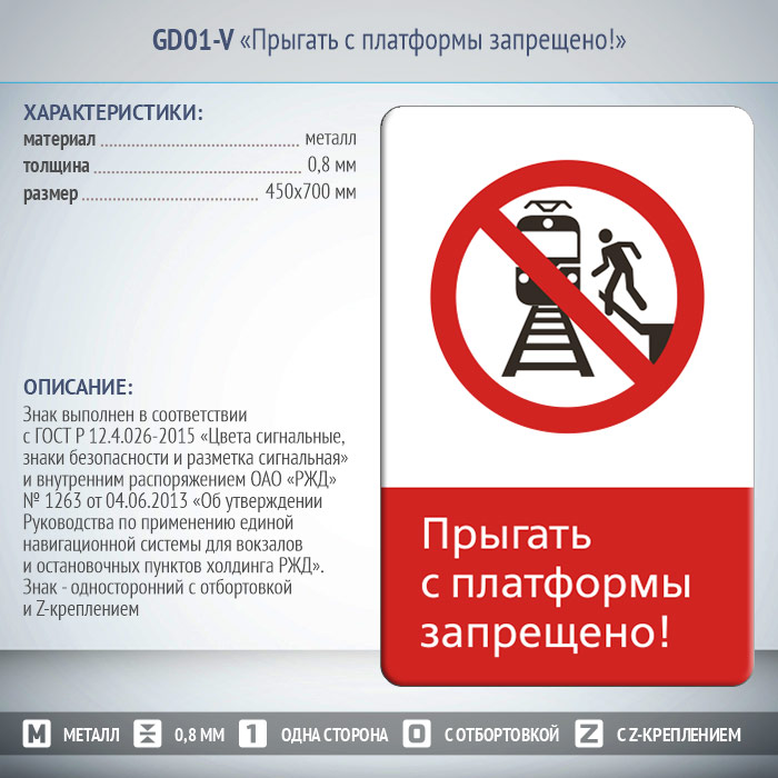 Знак «Прыгать с платформы запрещено!», GD01-V (односторонний вертикальный, 450х700 мм, металл, с отбортовкой и Z-креплением) в Волгограде купить