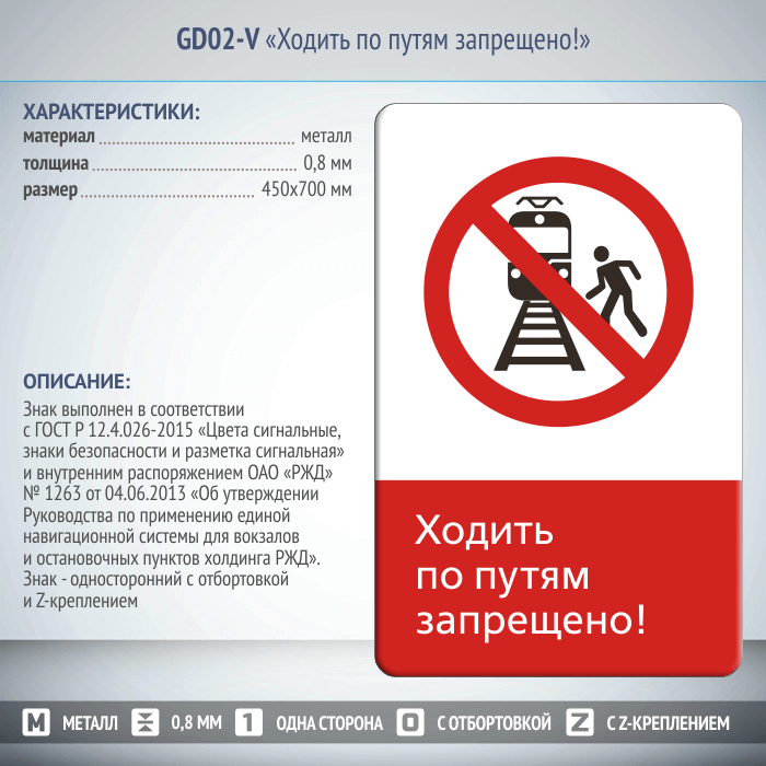 Знак «Ходить по путям запрещено!», GD02-V (односторонний вертикальный, 450х700 мм, металл, с отбортовкой и Z-креплением) в Волгограде купить