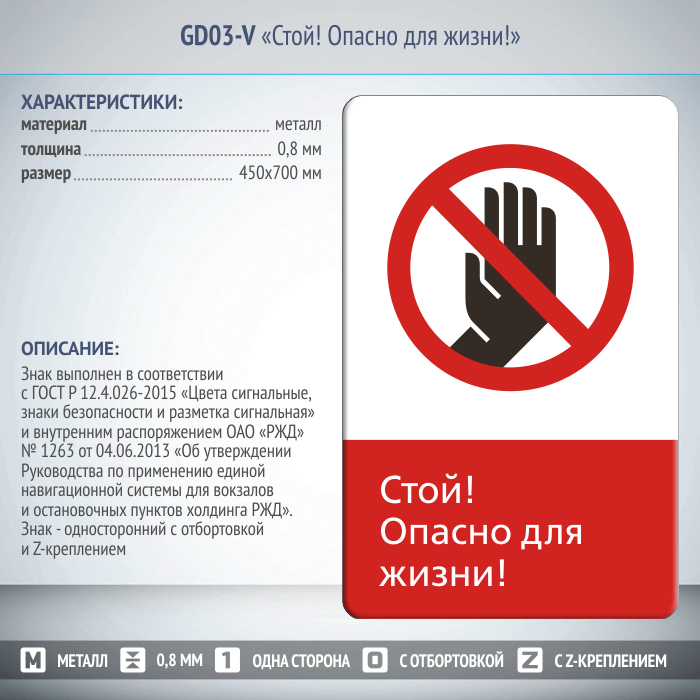 Знак «Стой! Опасно для жизни!», GD03-V (односторонний вертикальный, 450х700 мм, металл, с отбортовкой и Z-креплением) в Волгограде купить