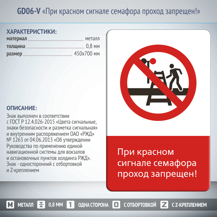 Знак «При красном сигнале семафора проход запрещен!», GD06-V (односторонний вертикальный, 450х700 мм, металл, с отбортовкой и Z-креплением) в Волгограде купить