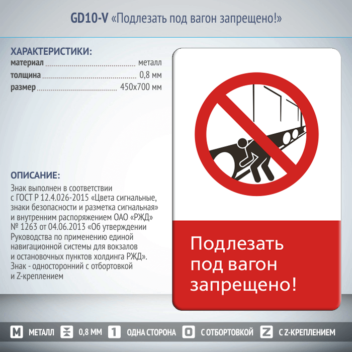 Знак «Подлезать под вагон запрещено!», GD10-V (односторонний вертикальный, 450х700 мм, металл, с отбортовкой и Z-креплением) в Волгограде купить