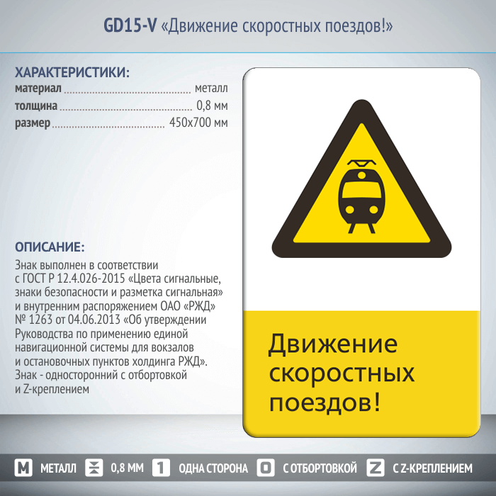 Знак «Движение скоростных поездов!», GD15-V (односторонний вертикальный, 450х700 мм, металл, с отбортовкой и Z-креплением) в Волгограде купить