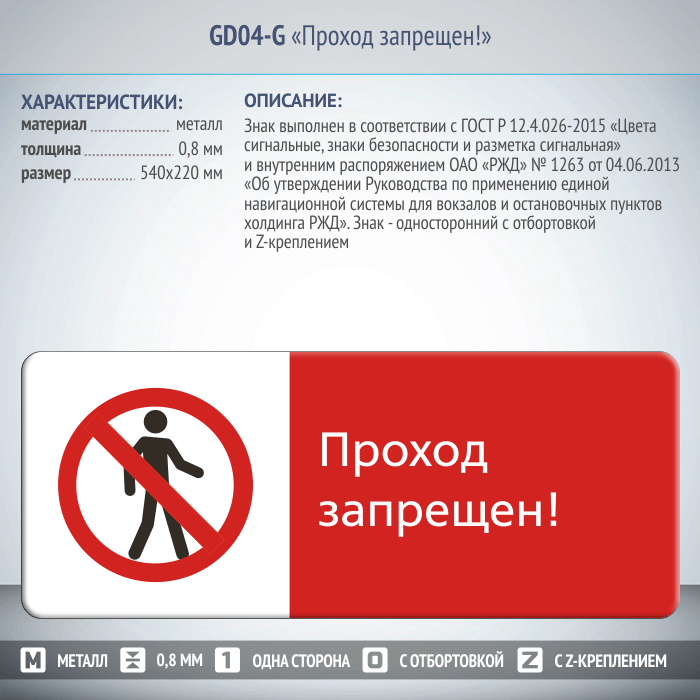 Знак «Проход запрещен!», GD04-G (односторонний горизонтальный, 540х220 мм, металл, с отбортовкой и Z-креплением) в Волгограде купить