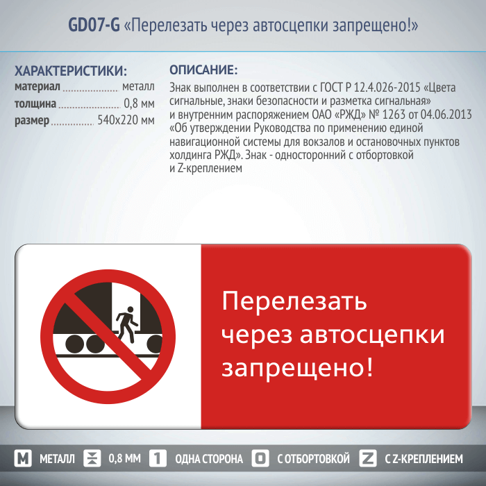 Знак «Перелезать через автосцепки запрещено!», GD07-G (односторонний горизонтальный, 540х220 мм, металл, с отбортовкой и Z-креплением) в Волгограде купить