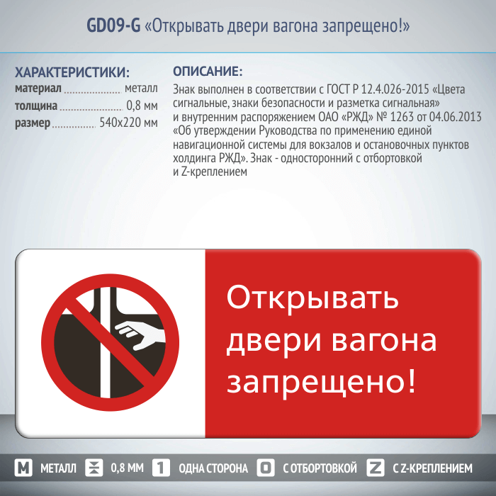 Знак «Открывать двери вагона запрещено!», GD09-G (односторонний горизонтальный, 540х220 мм, металл, с отбортовкой и Z-креплением) в Волгограде купить
