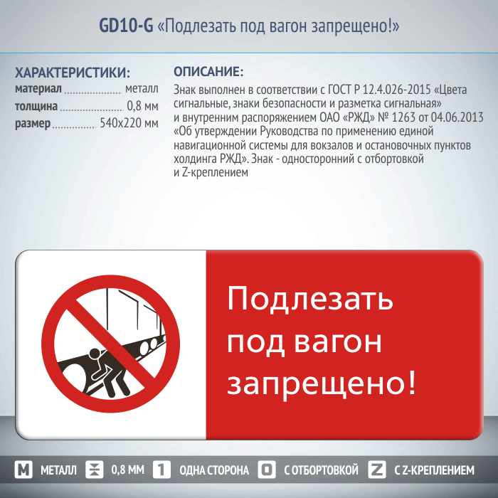 Знак «Подлезать под вагон запрещено!», GD10-G (односторонний горизонтальный, 540х220 мм, металл, с отбортовкой и Z-креплением) в Волгограде купить