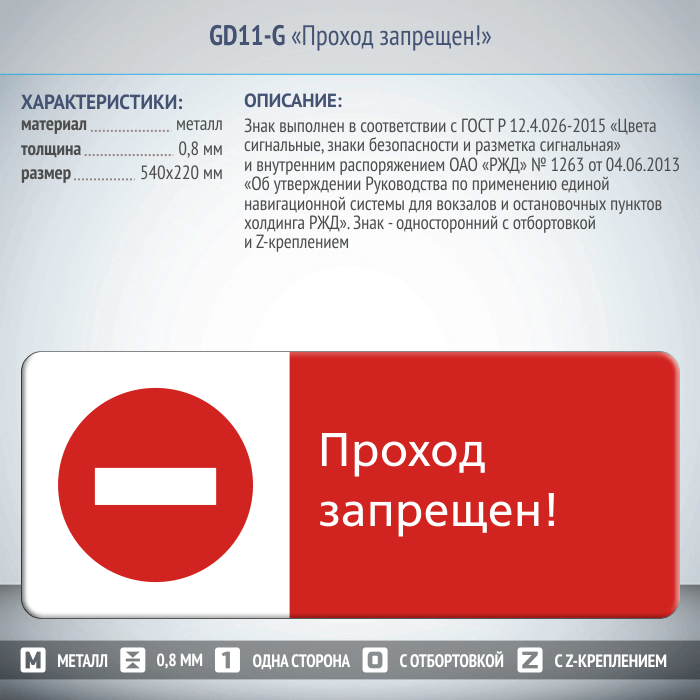 Знак «Проход запрещен!», GD11-G (односторонний горизонтальный, 540х220 мм, металл, с отбортовкой и Z-креплением) в Волгограде купить
