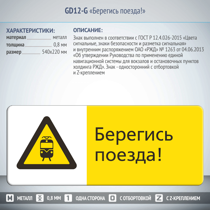 Знак «Берегись поезда!», GD12-G (односторонний горизонтальный, 540х220 мм, металл, с отбортовкой и Z-креплением) в Волгограде купить