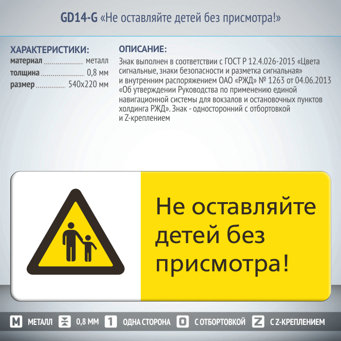 Знак «Не оставляйте детей без присмотра!», GD14-G (односторонний горизонтальный, 540х220 мм, металл, с отбортовкой и Z-креплением) в Волгограде купить