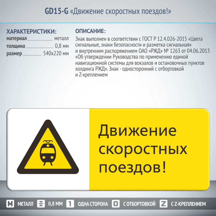 Знак «Движение скоростных поездов!», GD15-G (односторонний горизонтальный, 540х220 мм, металл, с отбортовкой и Z-креплением) в Волгограде купить