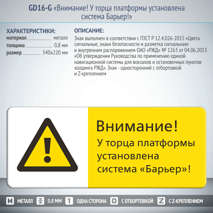 Знак «Внимание! У торца платформы установлена система Барьер!», GD16-G (односторонний горизонтальный, 540х220 мм, металл, с отбортовкой и Z-креплением) в Волгограде купить