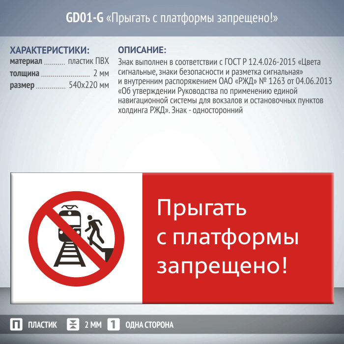 Знак «Прыгать с платформы запрещено!», GD01-G (односторонний горизонтальный, 540х220 мм, пластик 2 мм) в Волгограде купить