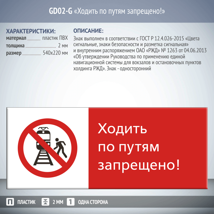 Знак «Ходить по путям запрещено!», GD02-G (односторонний горизонтальный, 540х220 мм, пластик 2 мм) в Волгограде купить