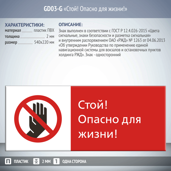 Знак «Стой! Опасно для жизни!», GD03-G (односторонний горизонтальный, 540х220 мм, пластик 2 мм) в Волгограде купить