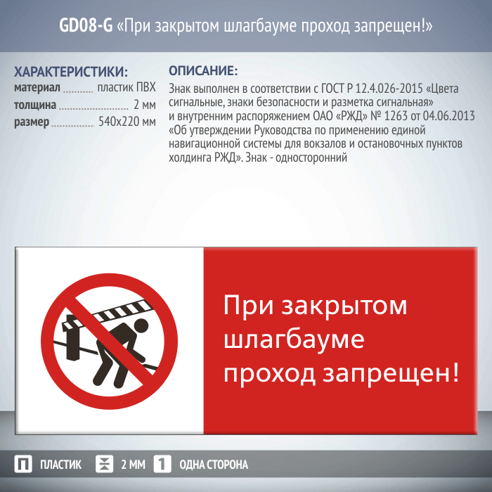 Знак «При закрытом шлагбауме проход запрещен!», GD08-G (односторонний горизонтальный, 540х220 мм, пластик 2 мм) в Волгограде купить