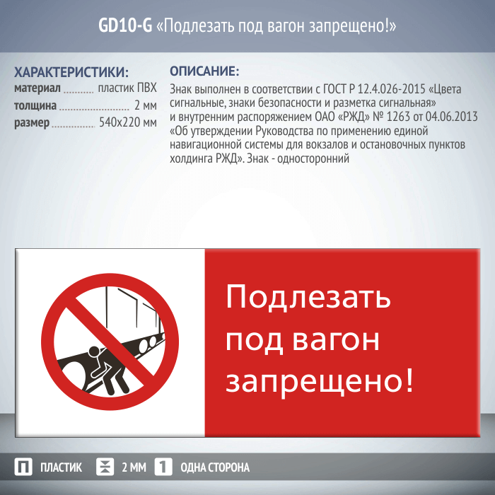 Знак «Подлезать под вагон запрещено!», GD10-G (односторонний горизонтальный, 540х220 мм, пластик 2 мм) в Волгограде купить