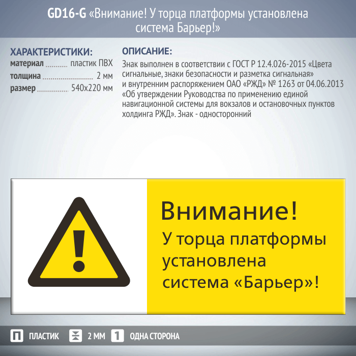 Знак «Внимание! У торца платформы установлена система Барьер!», GD16-G (односторонний горизонтальный, 540х220 мм, пластик 2 мм) в Волгограде купить