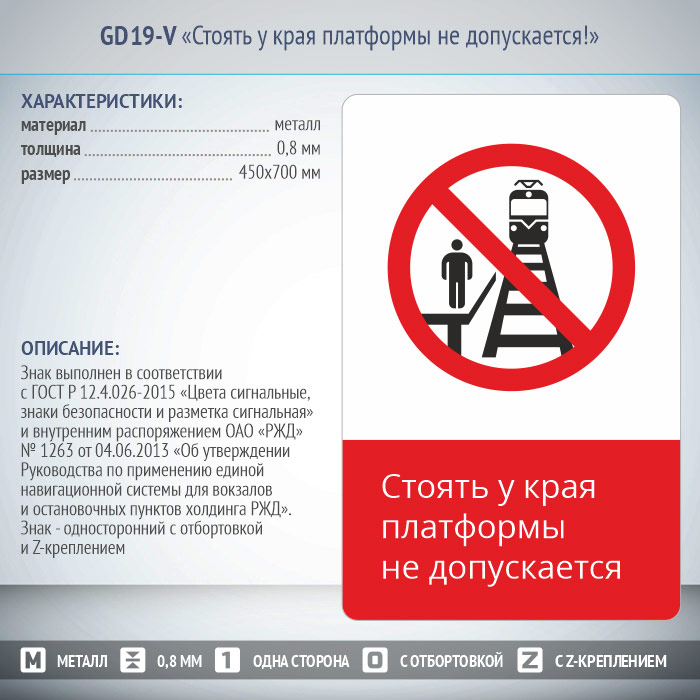 Знак «Стоять у края платформы не допускается!», GD19-V (односторонний вертикальный, 450х700 мм, металл, с отбортовкой и Z-креплением) в Волгограде купить
