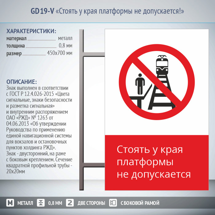 Знак «Стоять у края платформы не допускается!», GD19-V (двусторонний вертикальный, 450х700 мм, металл, на раме с боковым креплением) в Волгограде купить