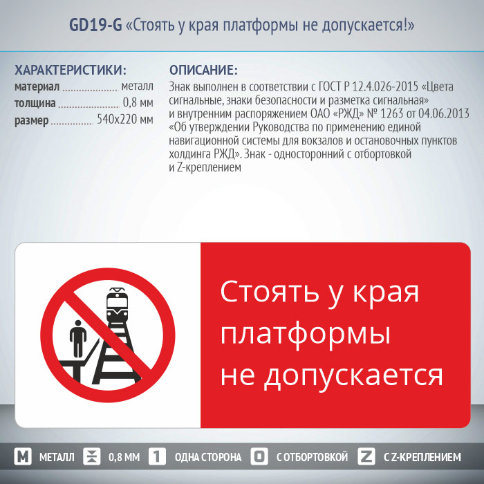 Знак «Стоять у края платформы не допускается!», GD19-G (односторонний горизонтальный, 540х220 мм, металл, с отбортовкой и Z-креплением) в Волгограде купить