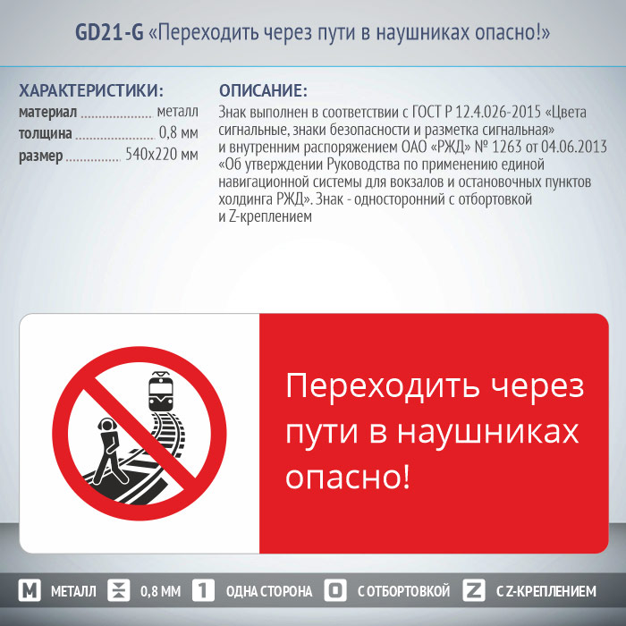 Знак «Переходить через пути в наушниках опасно!», GD21-G (односторонний горизонтальный, 540х220 мм, металл, с отбортовкой и Z-креплением) в Волгограде купить