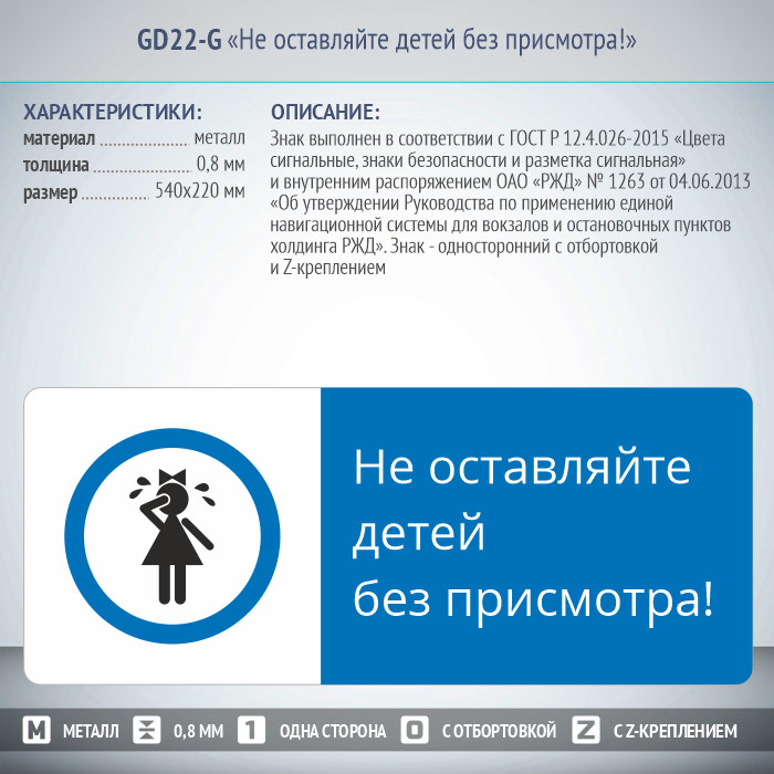Знак «Не оставляйте детей без присмотра!», GD22-G (односторонний горизонтальный, 540х220 мм, металл, с отбортовкой и Z-креплением) в Волгограде купить