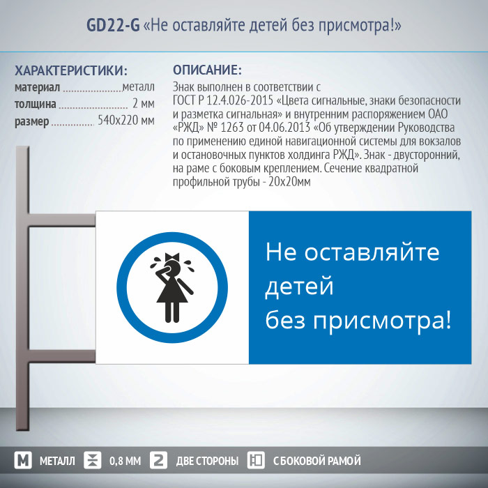 Знак «Не оставляйте детей без присмотра!», GD22-G (двусторонний горизонтальный, 540х220 мм, металл, на раме с боковым креплением) в Волгограде купить