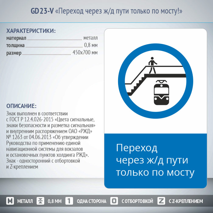 Знак «Переход через ж/д пути только по мосту!», GD23-V (односторонний вертикальный, 450х700 мм, металл, с отбортовкой и Z-креплением) в Волгограде купить