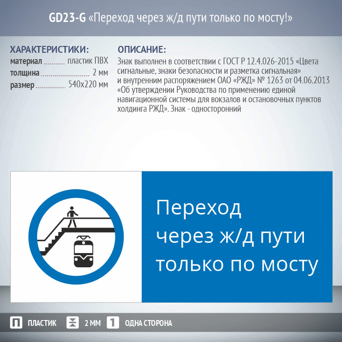 Знак «Переход через ж/д пути только по мосту!», GD23-G (односторонний горизонтальный, 540х220 мм, пластик 2 мм) в Волгограде купить