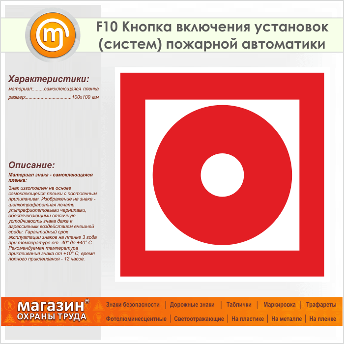 Знак F10 «Кнопка включения установок (систем) пожарной автоматики» (пленка, 100х100 мм) в Волгограде купить