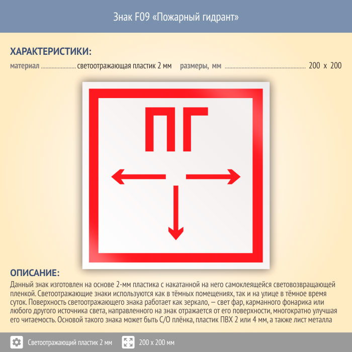 Знак F09 «Пожарный гидрант» (светоотражающий пластик, 200х200 мм) в Волгограде купить
