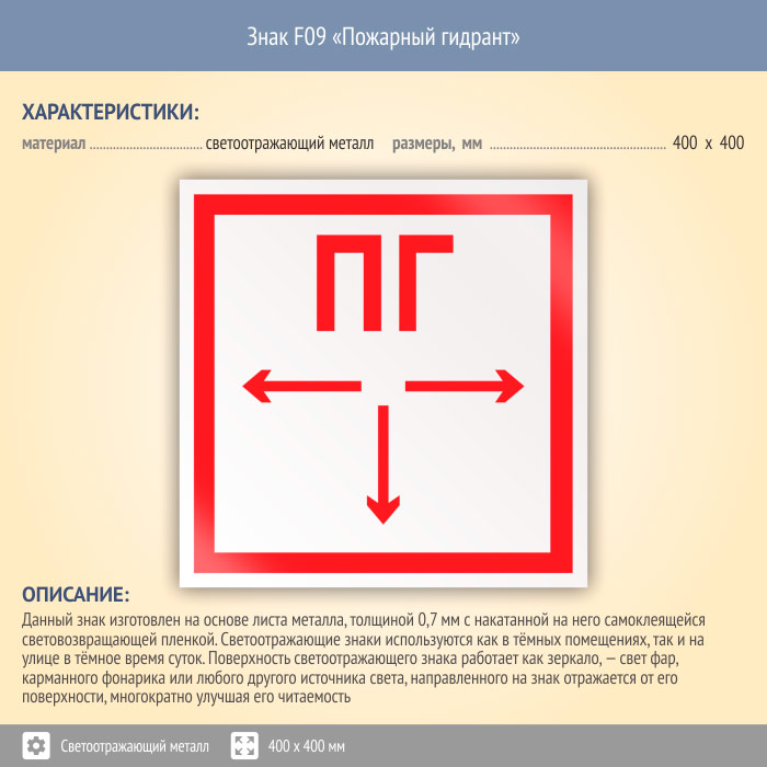 Знак F09 «Пожарный гидрант» (светоотражающий металл, 400х400 мм) в Волгограде купить