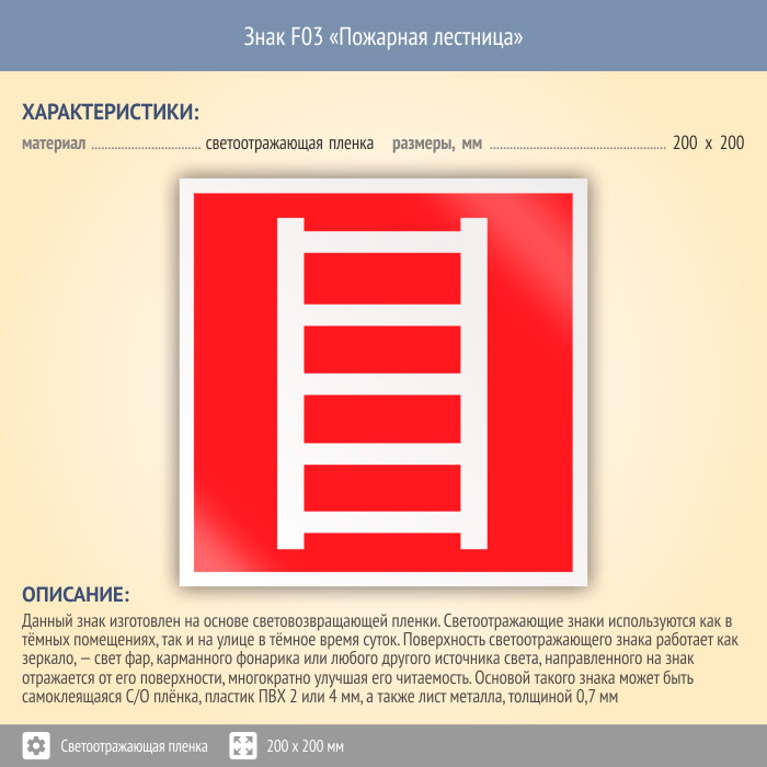 Знак F03 «Пожарная лестница» (светоотражающая пленка, 200х200 мм) в Волгограде купить