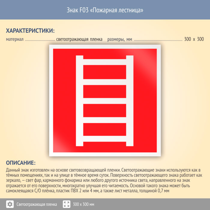 Знак F03 «Пожарная лестница» (светоотражающая пленка, 300х300 мм) в Волгограде купить