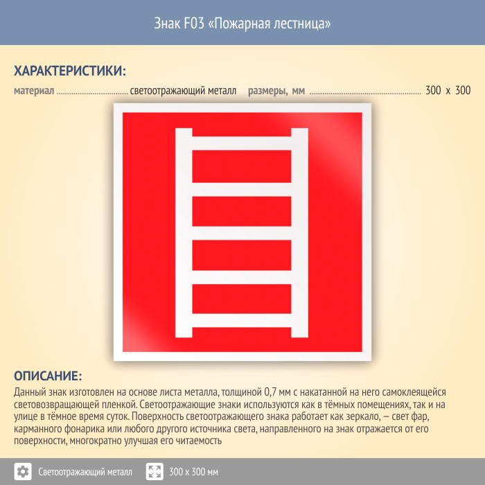 Знак F03 «Пожарная лестница» (светоотражающий металл, 300х300 мм) в Волгограде купить