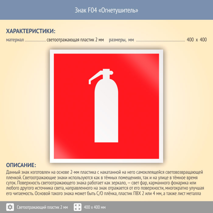 Знак F04 «Огнетушитель» (светоотражающий пластик, 400х400 мм) в Волгограде купить