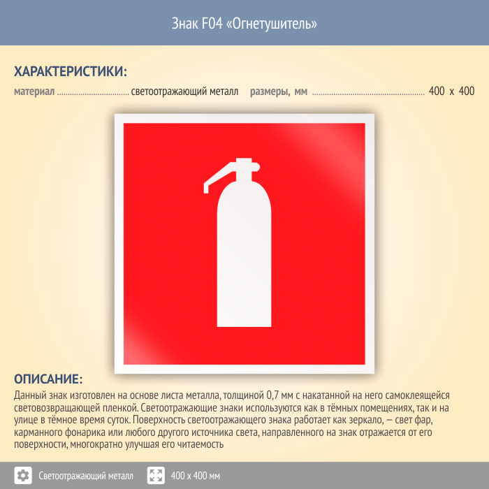 Знак F04 «Огнетушитель» (светоотражающий металл, 400х400 мм) в Волгограде купить