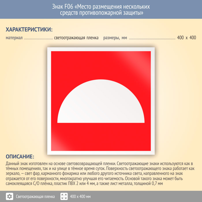 Знак F06 «Место размещения нескольких средств противопожарной защиты» (светоотражающая пленка, 400х400 мм) в Волгограде купить