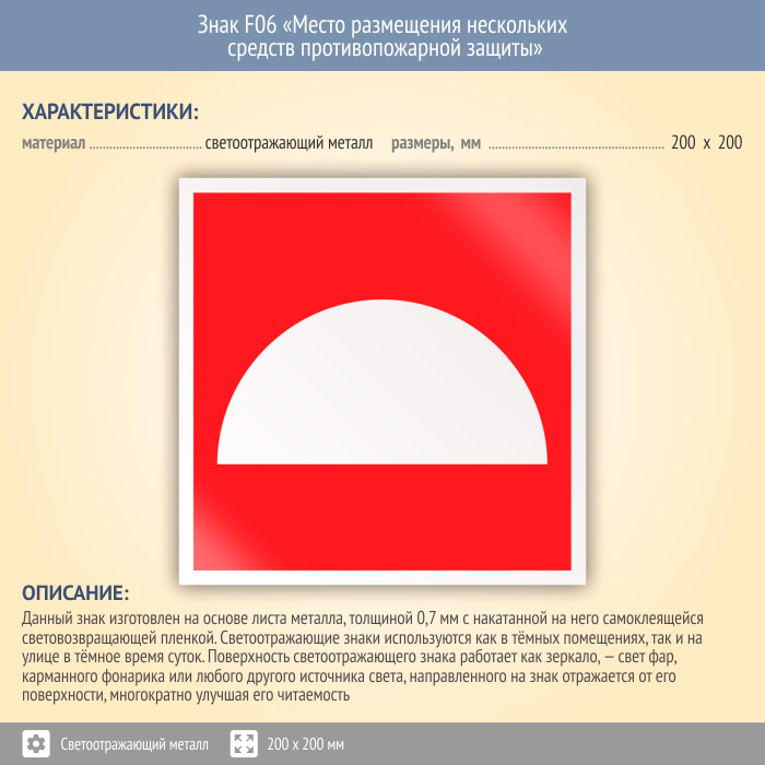 Знак F06 «Место размещения нескольких средств противопожарной защиты» (светоотражающий металл, 200х200 мм) в Волгограде купить