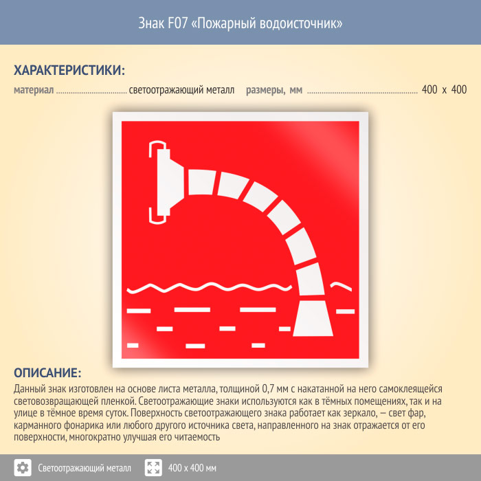 Знак F07 «Пожарный водоисточник» (светоотражающий металл, 400х400 мм) в Волгограде купить