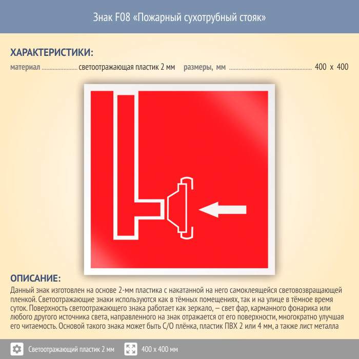 Знак F08 «Пожарный сухотрубный стояк» (светоотражающий пластик, 400х400 мм) в Волгограде купить