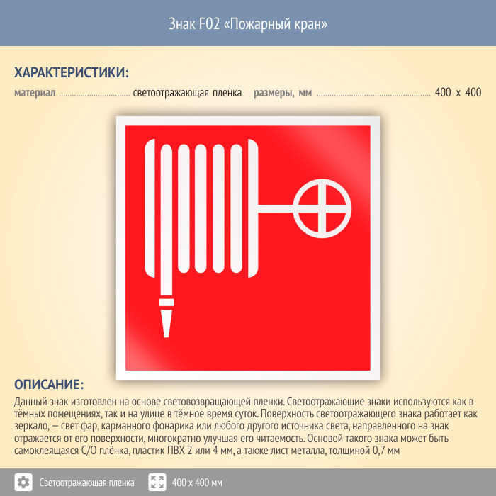 Знак F02 «Пожарный кран» (светоотражающая пленка, 400х400 мм) в Волгограде купить