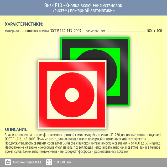 Знак F10 «Кнопка включения установок (систем) пожарной автоматики» (фотолюминесцентная пленка ГОСТ 34428-2018, 100х100 мм) в Волгограде купить
