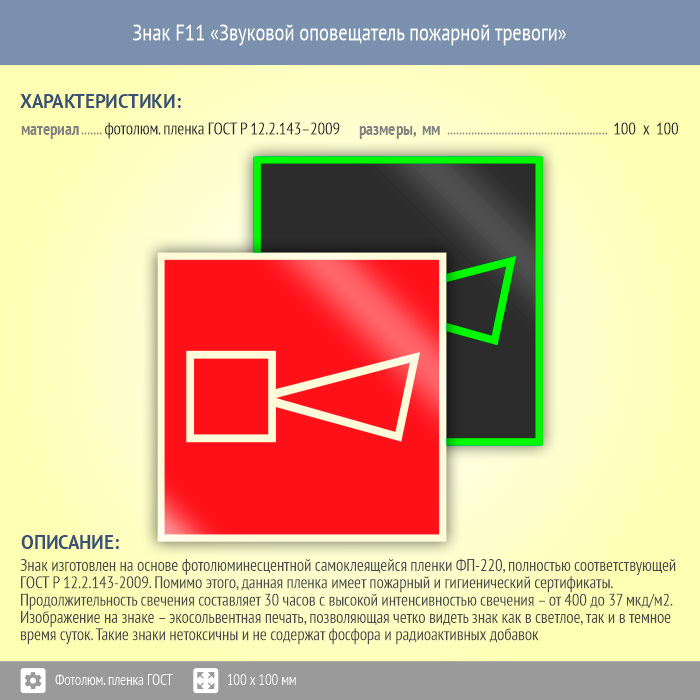 Знак F11 «Звуковой оповещатель пожарной тревоги» (фотолюминесцентная пленка ГОСТ 34428-2018, 100х100 мм) в Волгограде купить