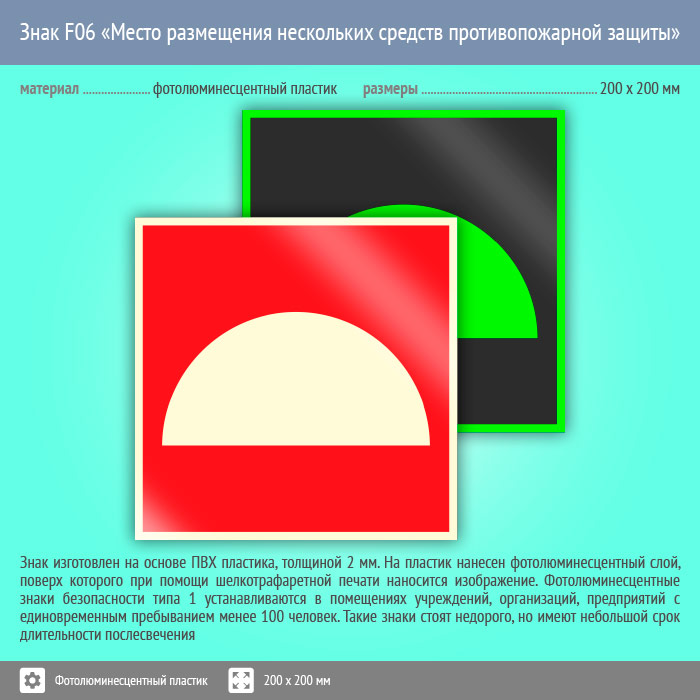 Знак F06 «Место размещения нескольких средств противопожарной защиты» (фотолюминесцентный пластик, 200х200 мм) в Волгограде купить