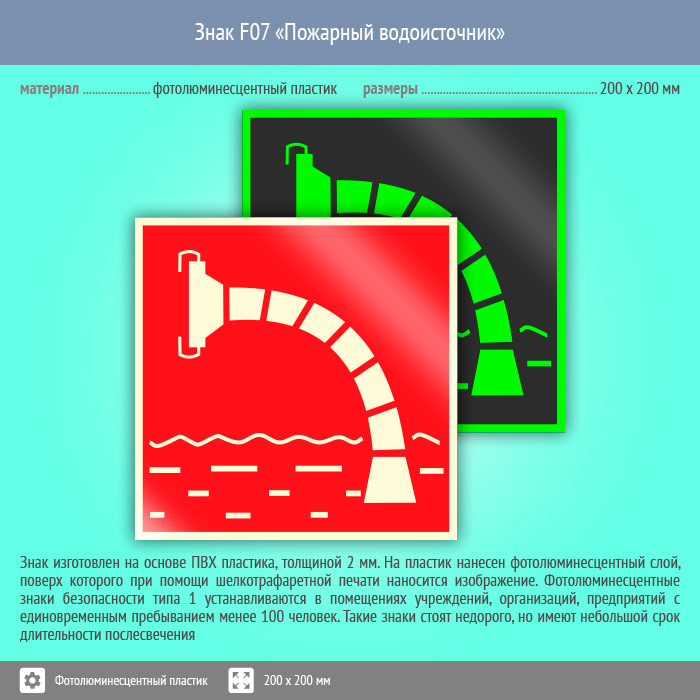 Знак F07 «Пожарный водоисточник» (фотолюминесцентный пластик, 200х200 мм) в Волгограде купить