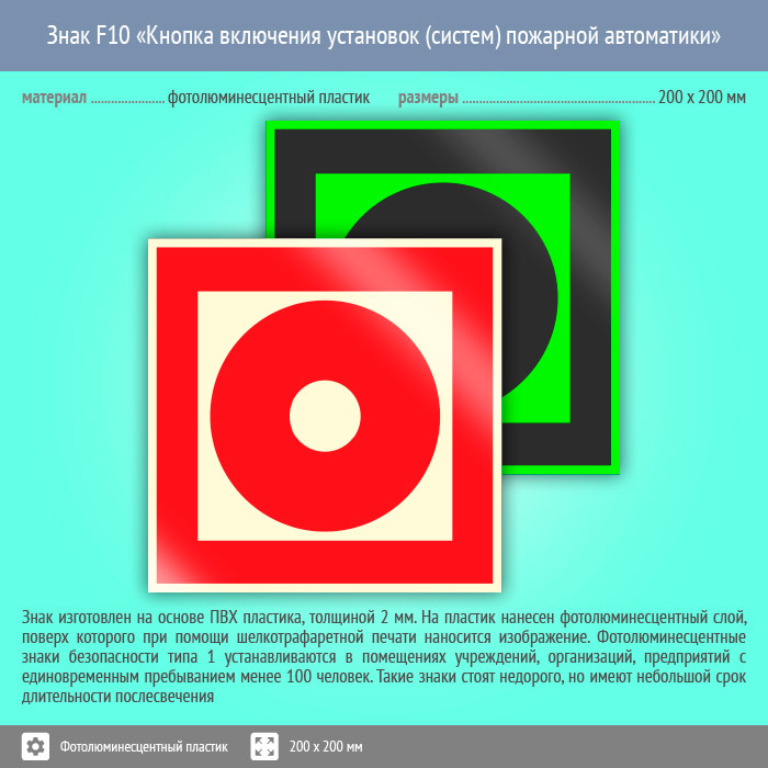 Знак F10 «Кнопка включения установок (систем) пожарной автоматики» (фотолюминесцентный пластик, 200х200 мм) в Волгограде купить