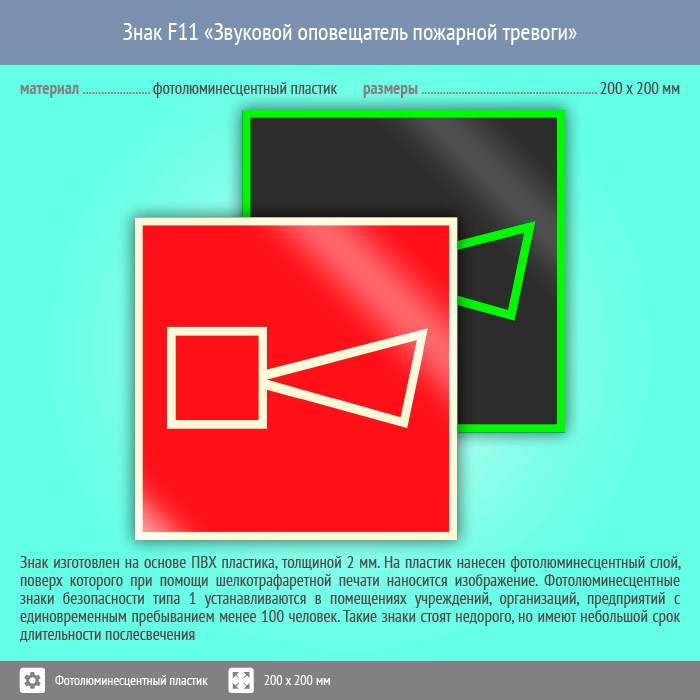 Знак F11 «Звуковой оповещатель пожарной тревоги» (фотолюминесцентный пластик, 200х200 мм) в Волгограде купить