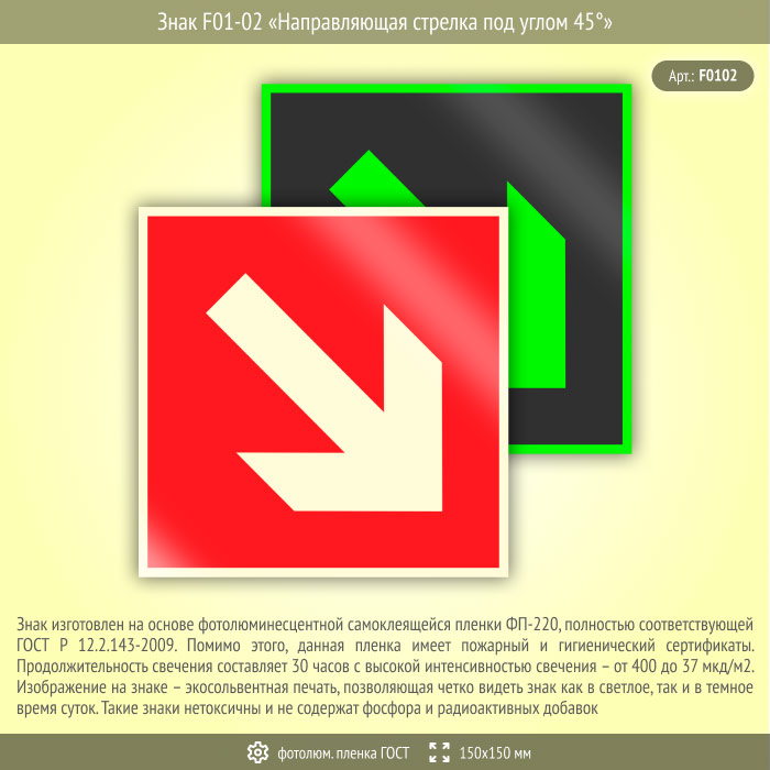 Знак F01-02 «Направляющая стрелка под углом 45°» (фотолюминесцентная пленка ГОСТ 34428-2018, 150х150 мм) в Волгограде купить