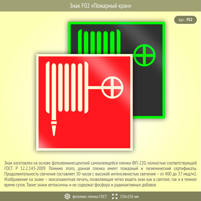 Знак F02 «Пожарный кран» (фотолюминесцентная пленка ГОСТ 34428-2018, 150х150 мм) в Волгограде купить